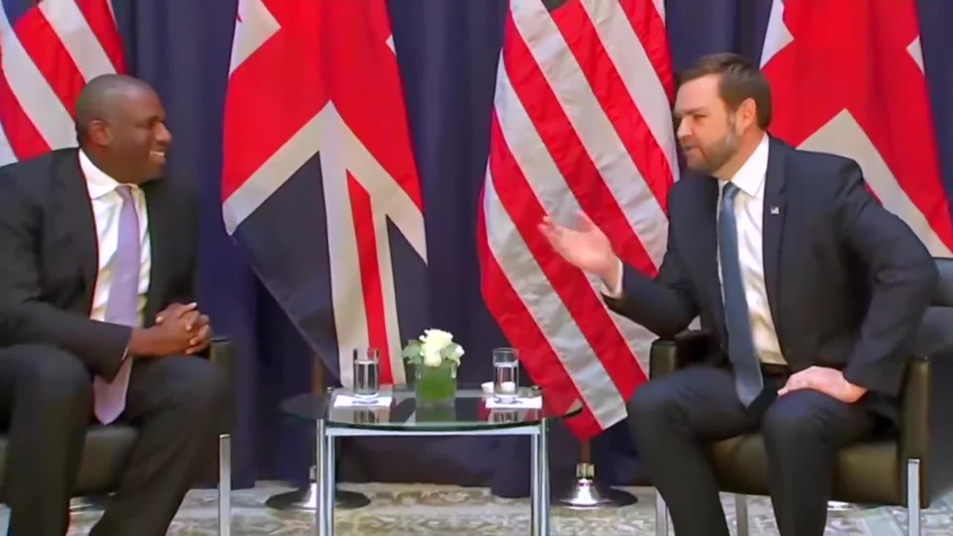 JD Vance: Great. Well, hello, everybody. Um, we're happy to host, uh, the UK delegation, uh, led of course by Foreign Secretary David Lammy, who I've known for a little while here. And obviously we have a lot in common. The special relationship betwe…