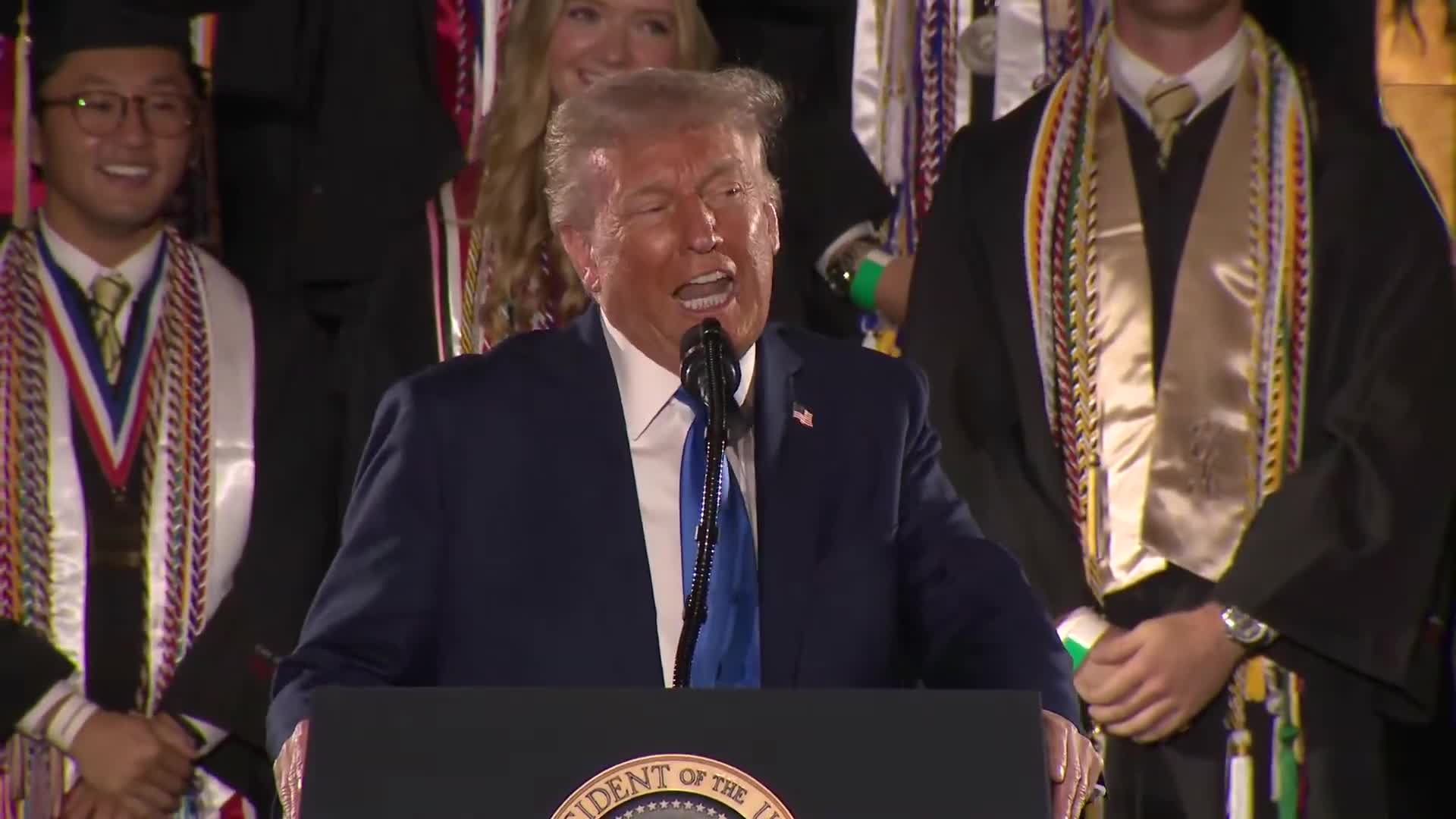 Donald Trump: Thank you, coach. Wow, what a nice-looking group this is. What a beautiful group of people. And especially a very big hello to the University of Alabama. Congratulations to the class of 2025. Roll Tide. Roll Tide. There are things that …
