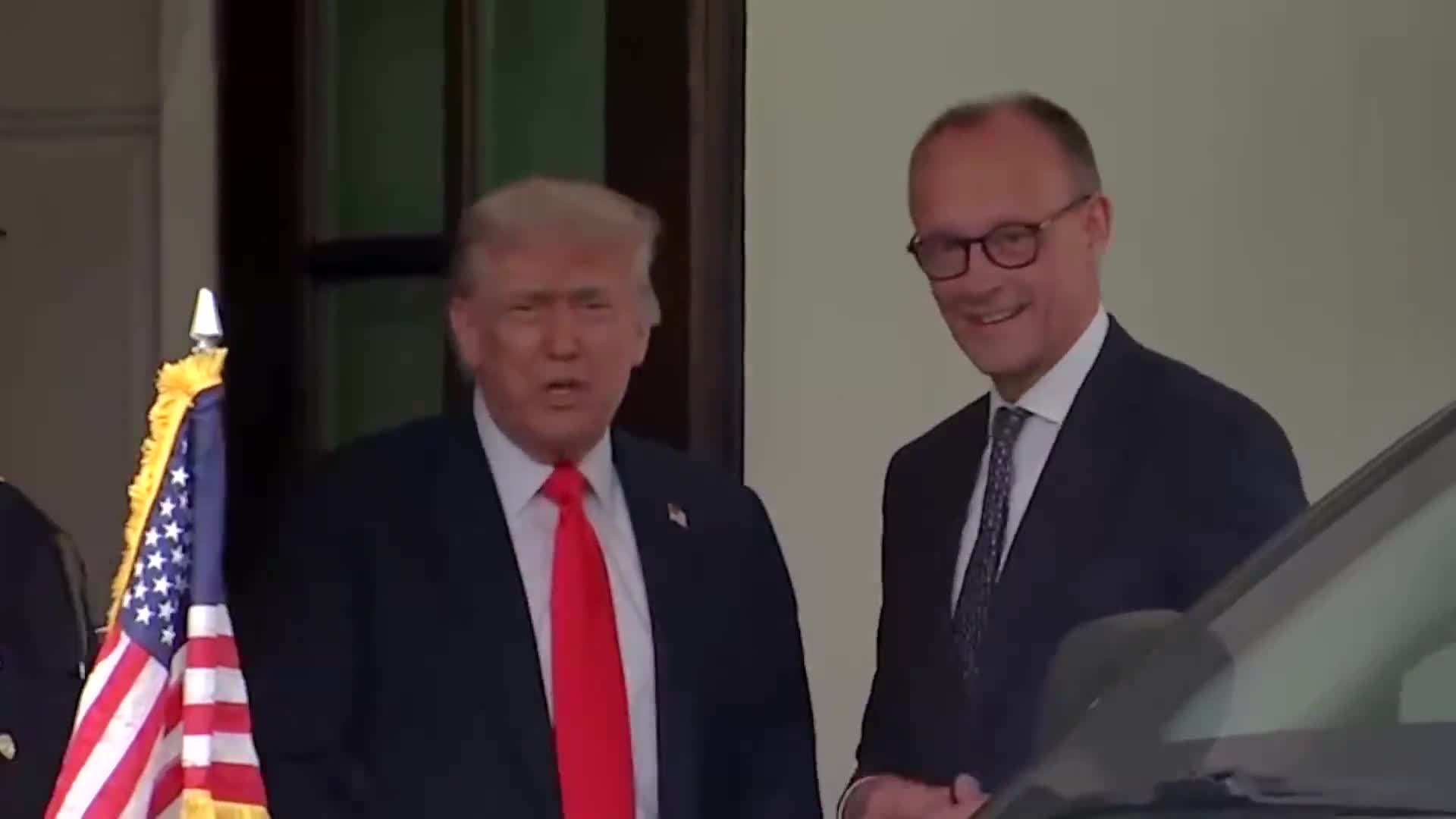 Donald Trump: Should we do that on camera? Friedrich Merz: Absolutely, sure. So, to let you know, this is the birth certificate of Donald Trump's grandfather born in 1869 close to Bad Durkheim. Donald Trump: Right. That's called serious -- Friedri…